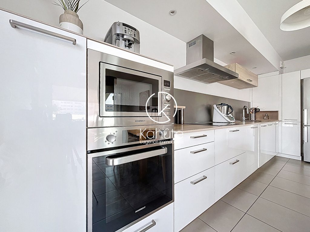 D’une pièce de vie lumineuse et climatisée, avec une cuisine ouverte parfaitement intégrée et équipée.