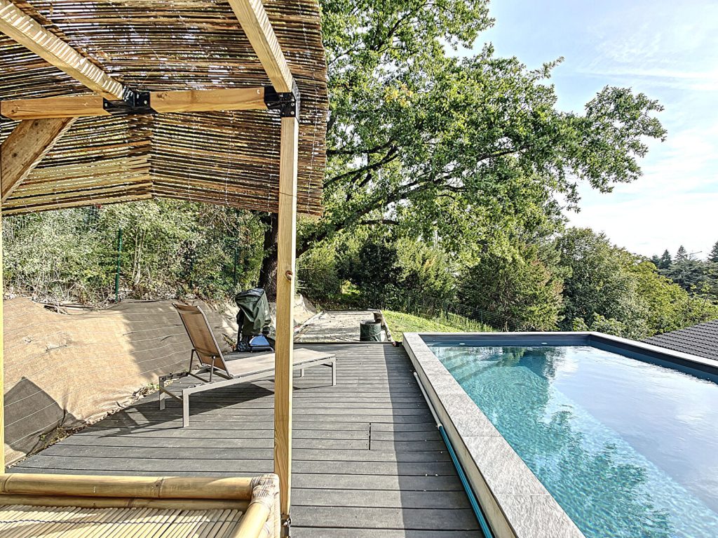 Dans le jardin idéalement exposé, vous aurez le plaisir de profiter d’une belle terrasse, d’un espace piscine, d’un terrain de pétanque et d’espaces verts avec une vue dégagée.