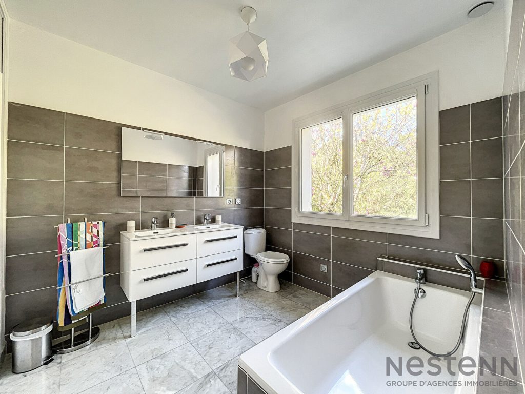 De l’autre côté de l’entrée, quelques marches vous mèneront à l’espace e nuit avec 3 chambres dont une suite parentale de 23m² , une salle d’eau, et un WC indépendant . Une 4ème chambre avec douche et lavabo a été aménagée au rez -de -chaussée .